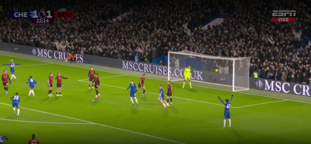 Una vez comenzado el partido, Chelsea sufrió el primer impacto a los 6 minutos, luego que David Brooks marcara el gol para el Bournemouth, que dejaba enmudecido el estadio. Sin embargo, a los 15′ llegó el empate por intermedio de un penal convertido por el inglés Cole Palmer, quien definió suave a la derecha de Djordje Petrovic.