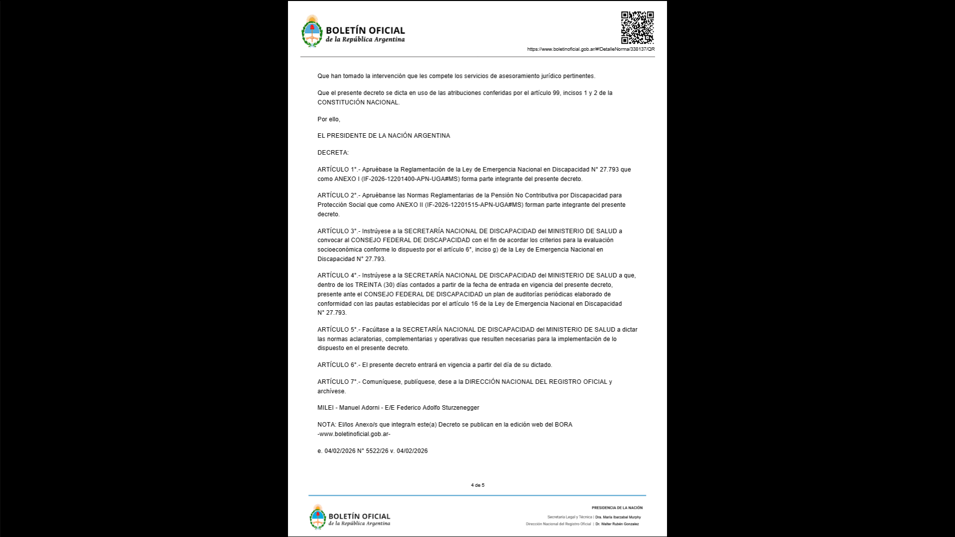 La reglamentación finalmente quedó en pie por medio del Decreto 84/2026 publicada hoy en el Boletín Oficial con las firmas de Milei; el Jefe de Gabinete, Manuel Adorni y el ministro de Desregulación y Transformación del Estado, Federico Sturzenegger.