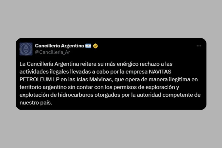 “Asimismo, se recuerda que, mediante la Resolución de la Secretaría de Energía N° 240/2022 del 18 de abril de 2022, la empresa NAVITAS PETROLEUM LP fue declarada clandestina y sus actividades calificadas de ilegales por desarrollar operaciones hidrocarburíferas en territorio argentino sin autorización de las autoridades competentes”, se indica en el mensaje.