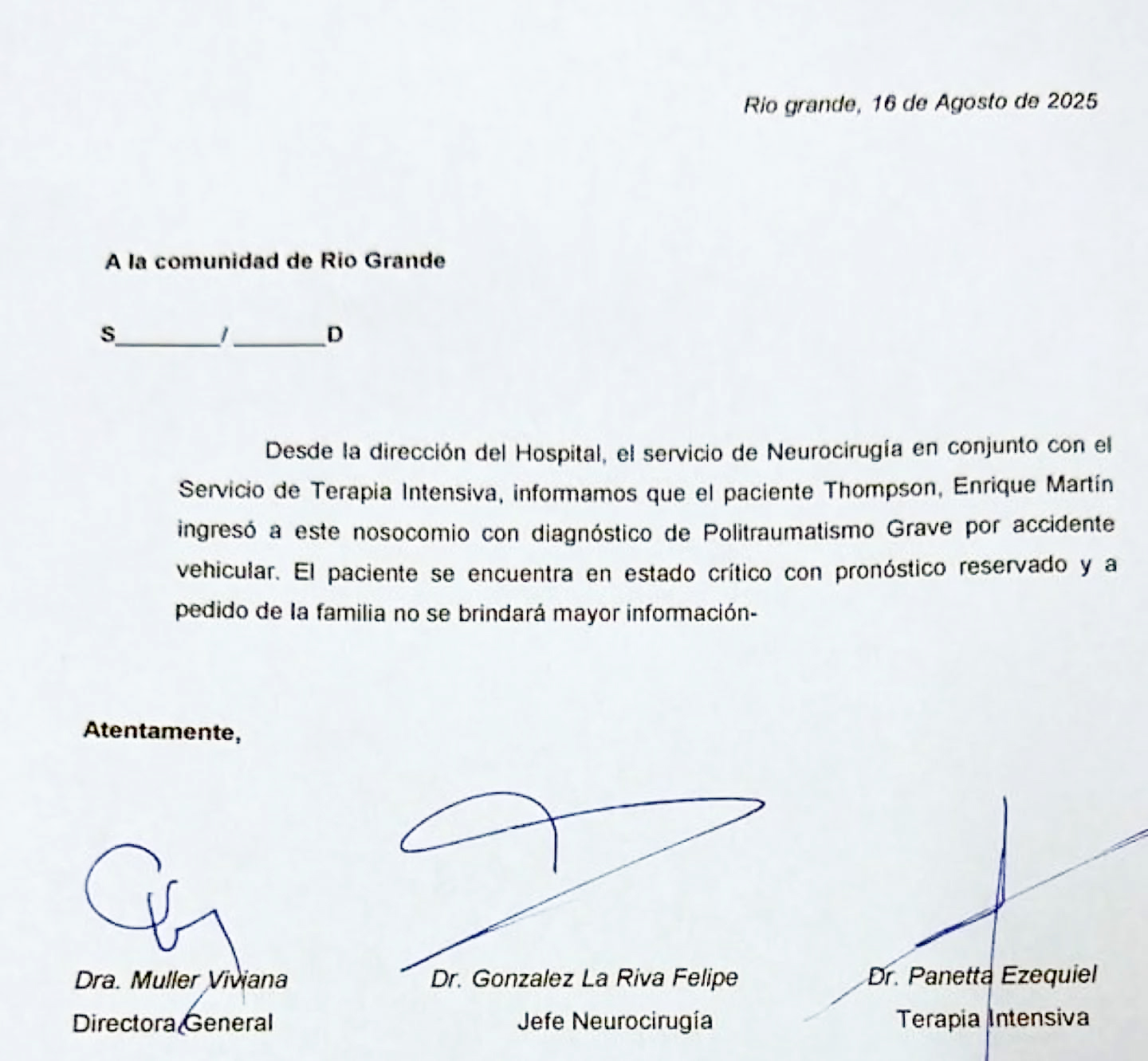 El comunicado firmado por la directora general, Dra. Viviana Muller, el jefe de Neurocirugía, Dr. Felipe González La Riva, y el especialista en Terapia Intensiva, Dr. Ezequiel Panetta, el paciente ingresó al nosocomio con diagnóstico de politraumatismo grave producto del siniestro vial sufrido durante la competencia.
