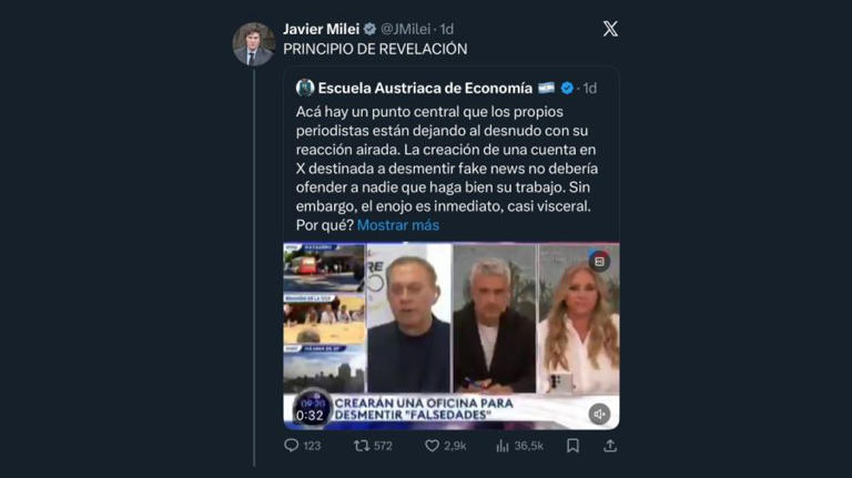 Milei también apuntó duramente contra el periodista Marcelo Bonelli, quien suele cuestionar el programa económico del Gobierno en sus columnas en Clarín, y sobre un recorte donde el comunicador habla del chequeo de información, afirmando que no siempre se chequean los datos al 100%, aseveró: «PRINCIPIO DE REVELACIÓN».