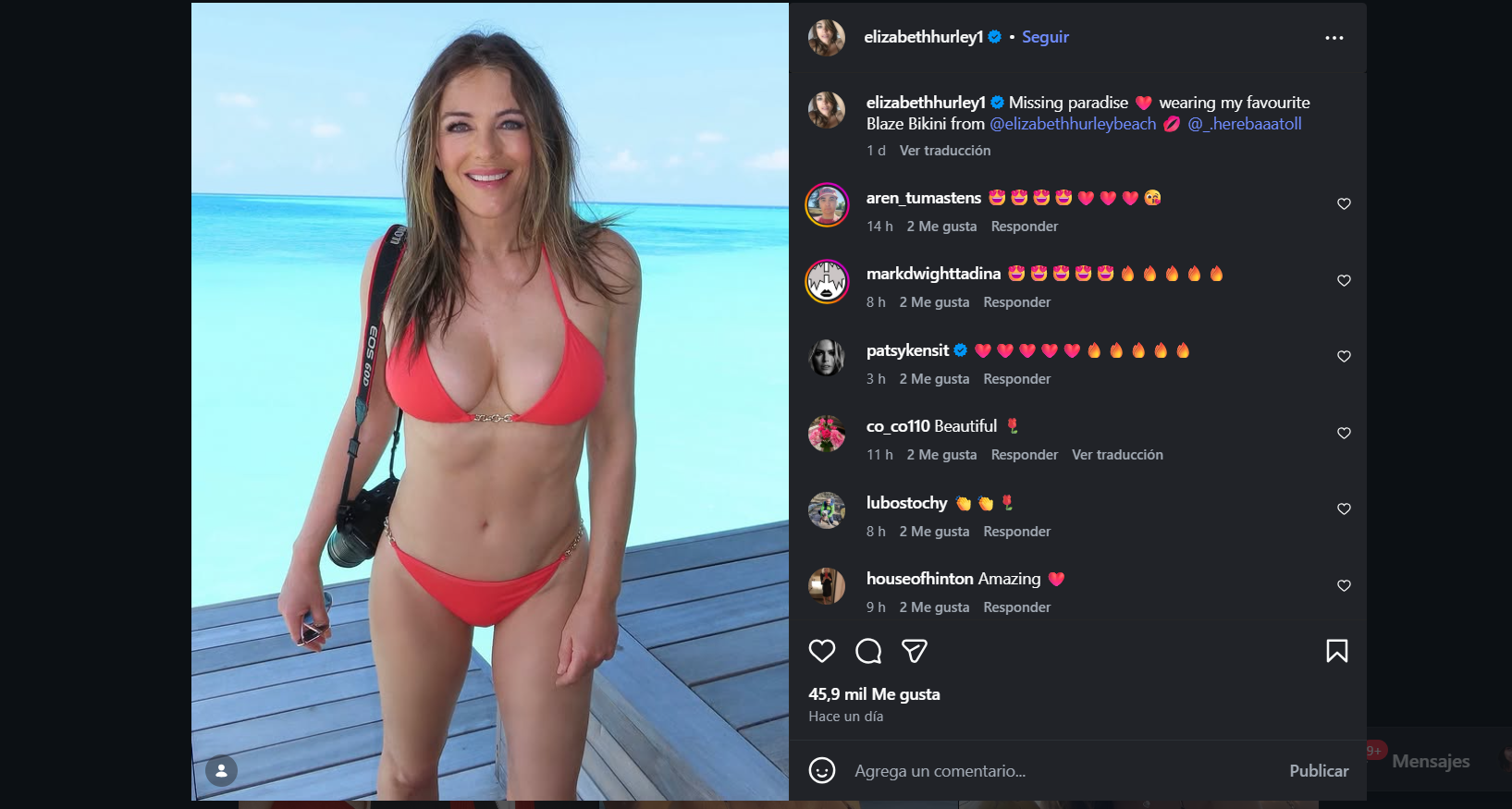 Con esta publicación, Elizabeth Hurley continúa celebrando su amor por los ambientes náuticos y sus propias creaciones. Este look rojo con detalles dorados refuerza su imagen de espíritu libre y segura de sí misma junto al agua.