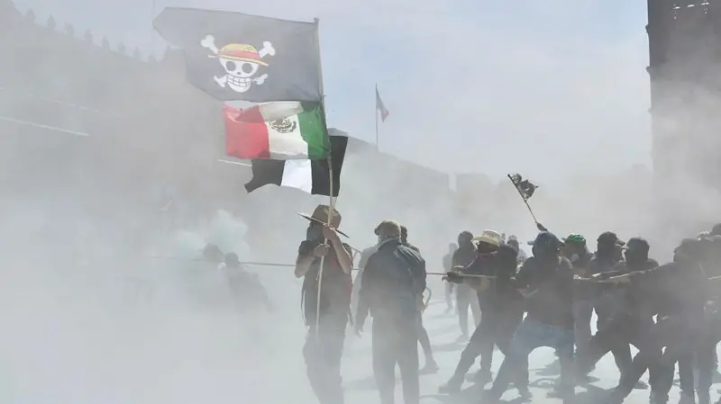 Un manifestante sostiene una bandera del manga One Piece y una bandera de México durante una protesta contra el gobierno de la presidenta