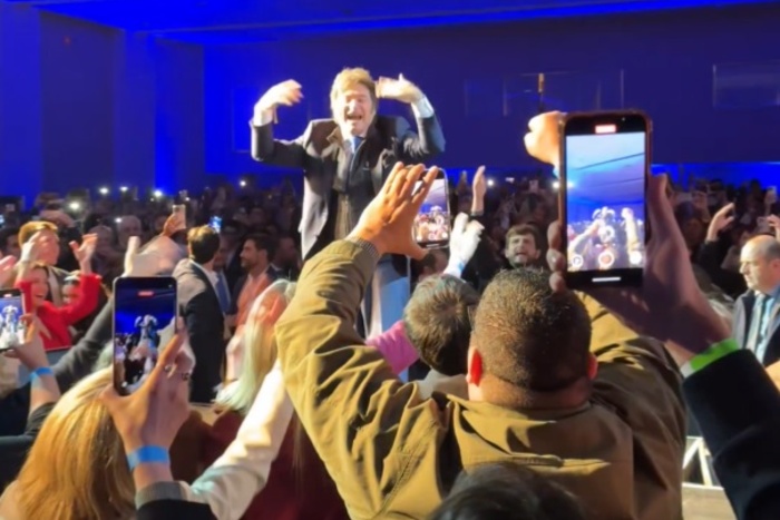 Minutos después de las las 21, el mandatario, cuya disertación llevó el nombre «La construcción del milagro», entró al escenario del Hotel Quórum como si fuera un rockstar al ritmo de Panic show de La Renga, aplaudido y vitoreado por aquellos que pagaron la entrada del evento privado y sin transmisión oficial.