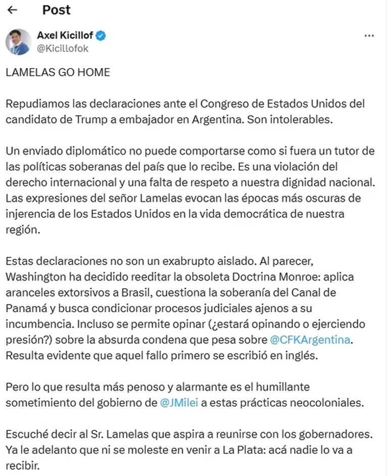 «Las expresiones del señor Lamelas evocan las épocas más oscuras de injerencia de los Estados Unidos en la vida democrática de nuestra región. Estas declaraciones no son un exabrupto aislado. Al parecer, Washington ha decidido reeditar la obsoleta Doctrina Monroe: aplica aranceles extorsivos a Brasil, cuestiona la soberanía del Canal de Panamá y busca condicionar procesos judiciales ajenos a su incumbencia», escribió el gobernador bonaerense en un posteo de X.