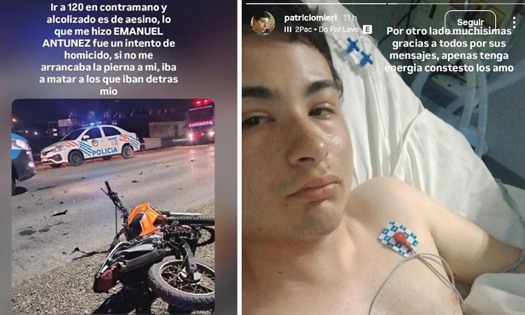 RÍO GRANDE. – Patricio Mieri (27), el joven motociclista que resultó gravemente herido en un siniestro vial ocurrido el sábado a la noche, acusó al automovilista que lo embistió de haber intentado matarlo. A través de sus redes sociales, indicó «“Ir a 120 en contramano es de asesino. Lo que me hizo Emanuel Antúnez fue un intento de homicidio. Si no me arrancaba la pierna, me iba a matar junto a los que venían detrás mío”.